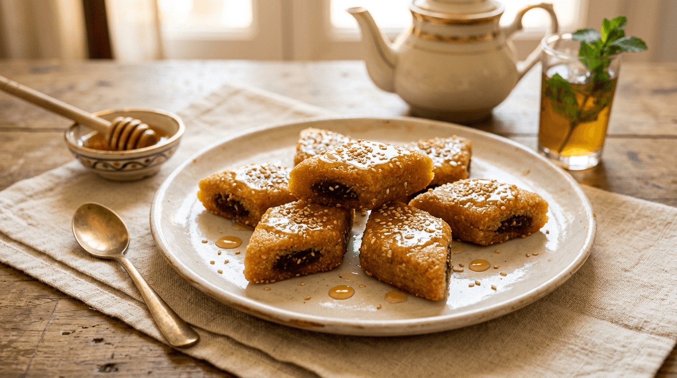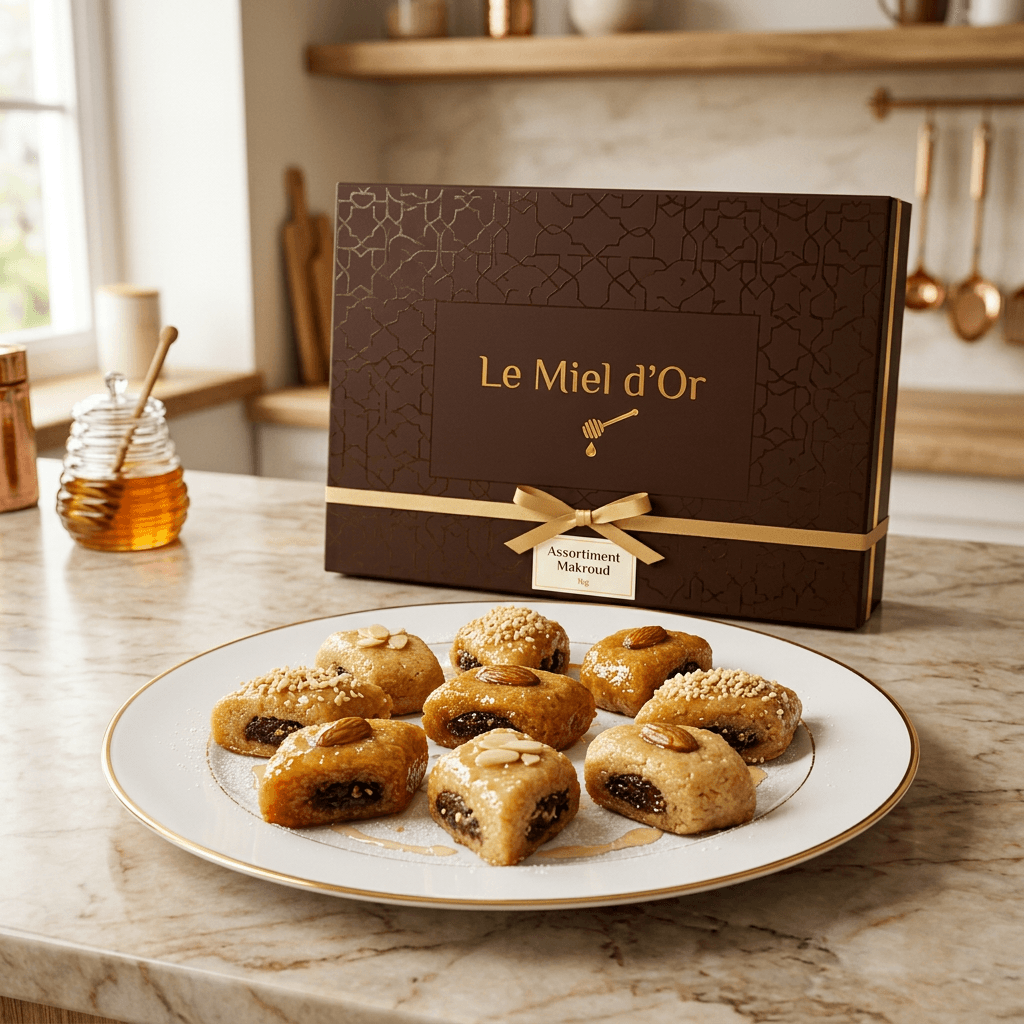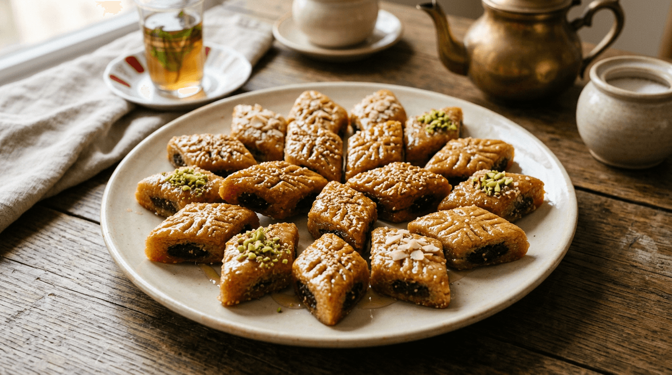 Algerian makroud platter in three varieties: Constantine Deglet Nour date makroud, almond paste makroud and walnut makroud. Deep-fried and coated in golden syrup.
