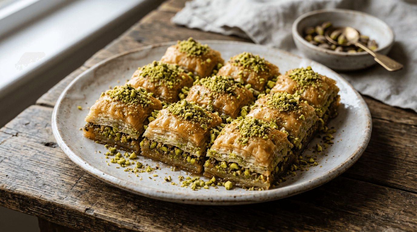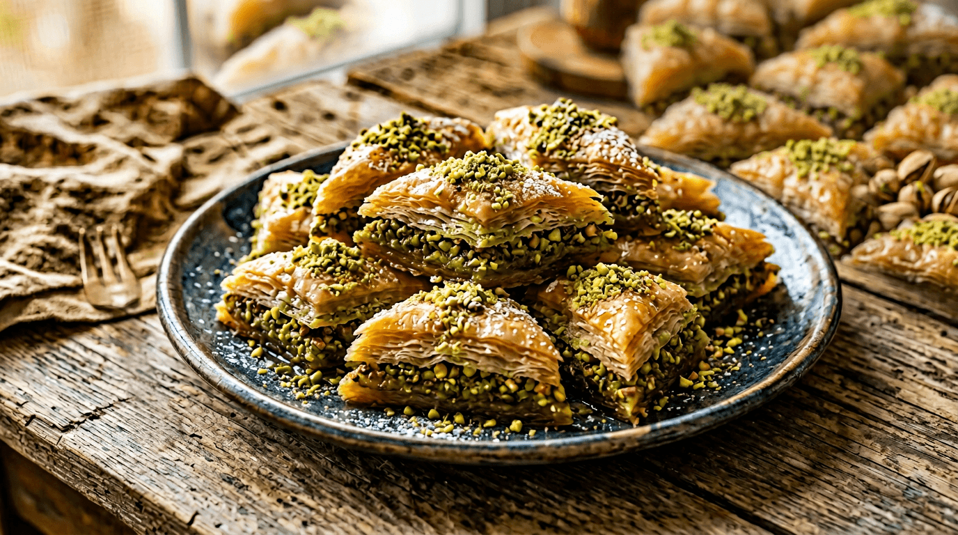 Flaky baklawa with premium crushed pistachios. Layers of crispy phyllo pastry, generously soaked in honey and orange blossom syrup.