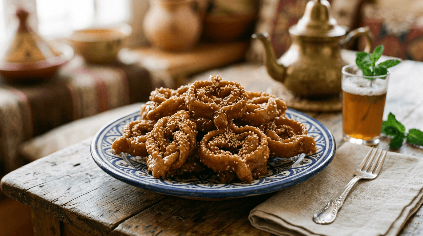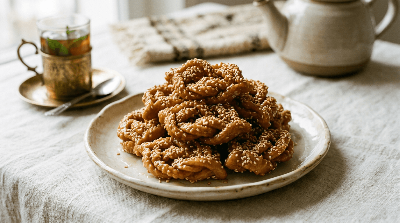 Traditional hand-braided griwech, fried and dipped in golden honey syrup, sprinkled with sesame seeds. Iconic Ramadan pastry, crispy and fragrant.