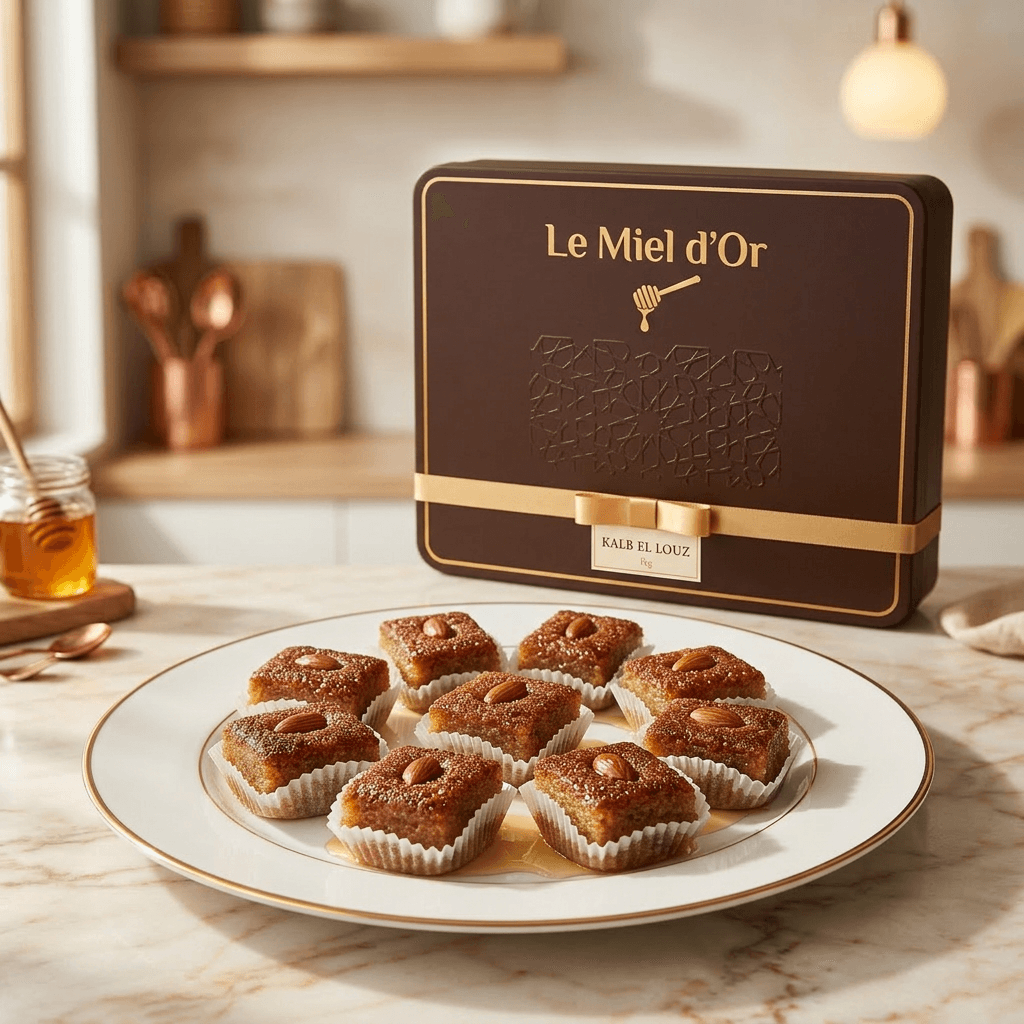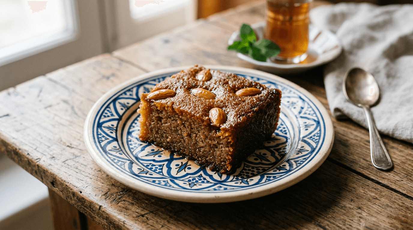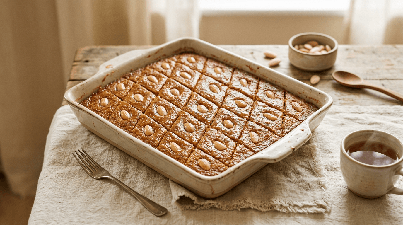 Soft semolina cake with almond paste, coated in lemon syrup scented with rose water. Melt-in-your-mouth texture and delicate flavor. Cut into elegant diamond shapes.