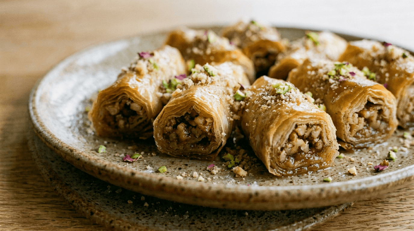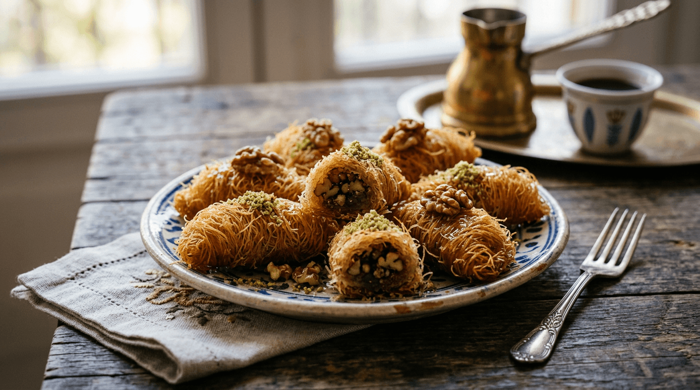 Crispy angel hair (ktayef) rolls stuffed with crushed walnuts, scented with orange blossom water. Oven-baked and drizzled with syrup.