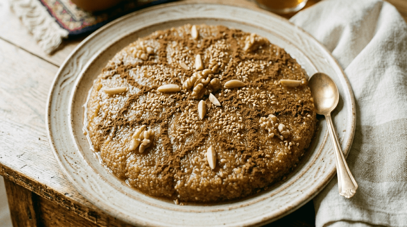 Smooth tamina made from roasted semolina, pure honey and melted butter, dusted with cinnamon. Iconic sweet served at births and celebrations. Naturally honey-sweetened.